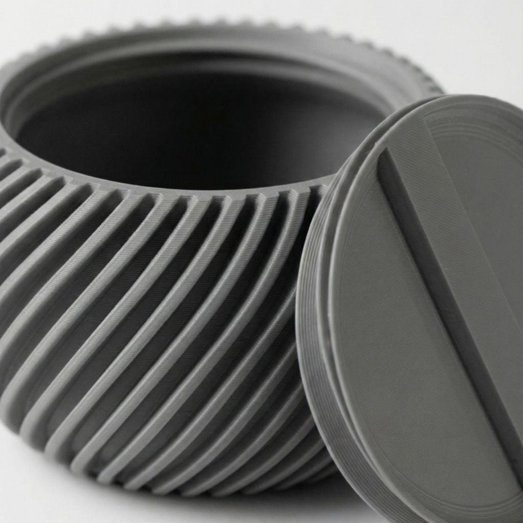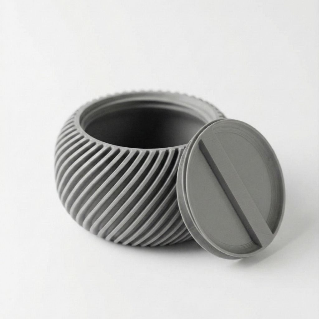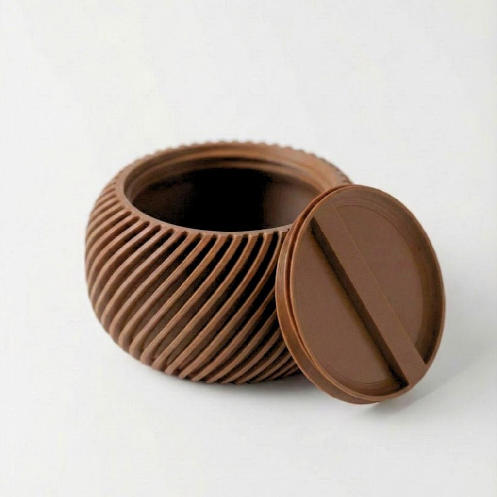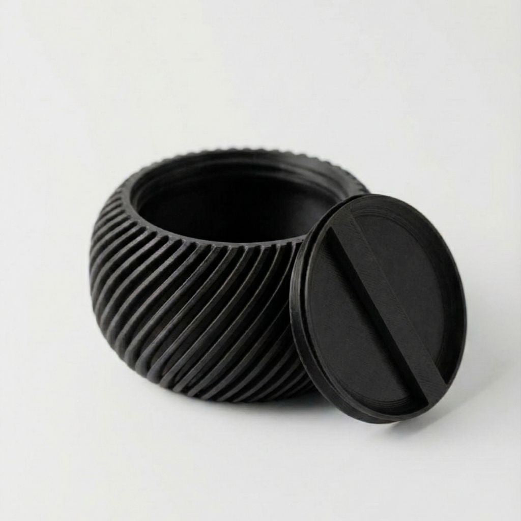 Caja organizadora esférica de textura acanalada con tapa de ajuste preciso, diseñada para el almacenamiento de objetos pequeños. Su diseño compacto elimina el ruido visual del escritorio. Impresa en 3D, ofrece una estructura ligera pero resistente con un acabado mate profesional.