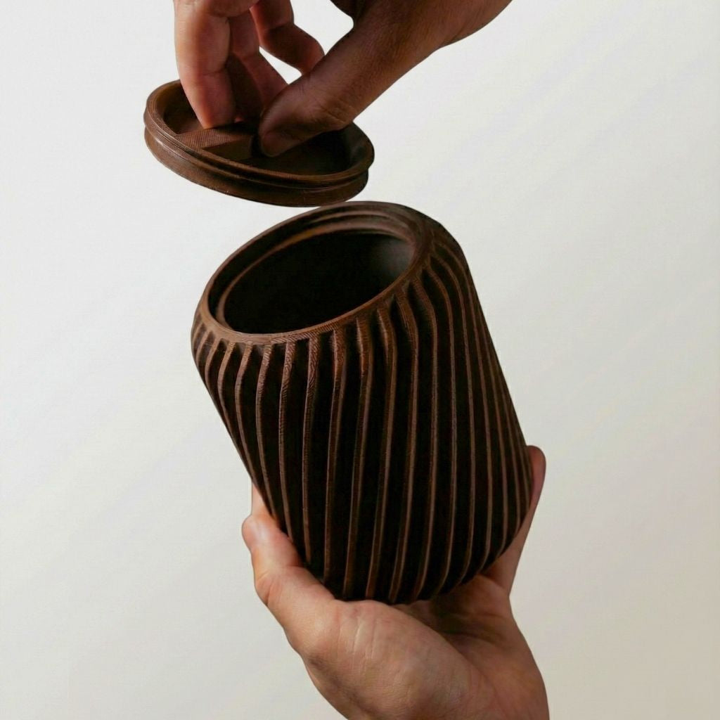 El organizador Wave con tapa de diseño texturizado ondulado, ideal para el resguardo insumos pequeños y la reducción del ruido visual en el escritorio. Fabricado en PLA biodegradable, garantiza durabilidad y un acabado mate de tacto sólido.