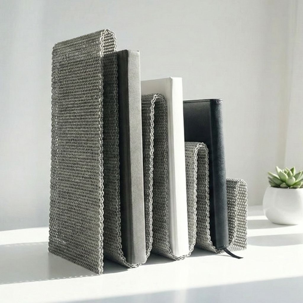 Organizador vertical de diseño ondulado y perfil escalonado, optimizado para separar documentos, libros o dispositivos. Su disposición en niveles facilita la visualización y el acceso rápido a tareas pendientes, maximizando el espacio útil de trabajo. Fabricado en material biodegradable resistente mediante impresión 3D, ofrece una estructura texturizada duradera y estética.