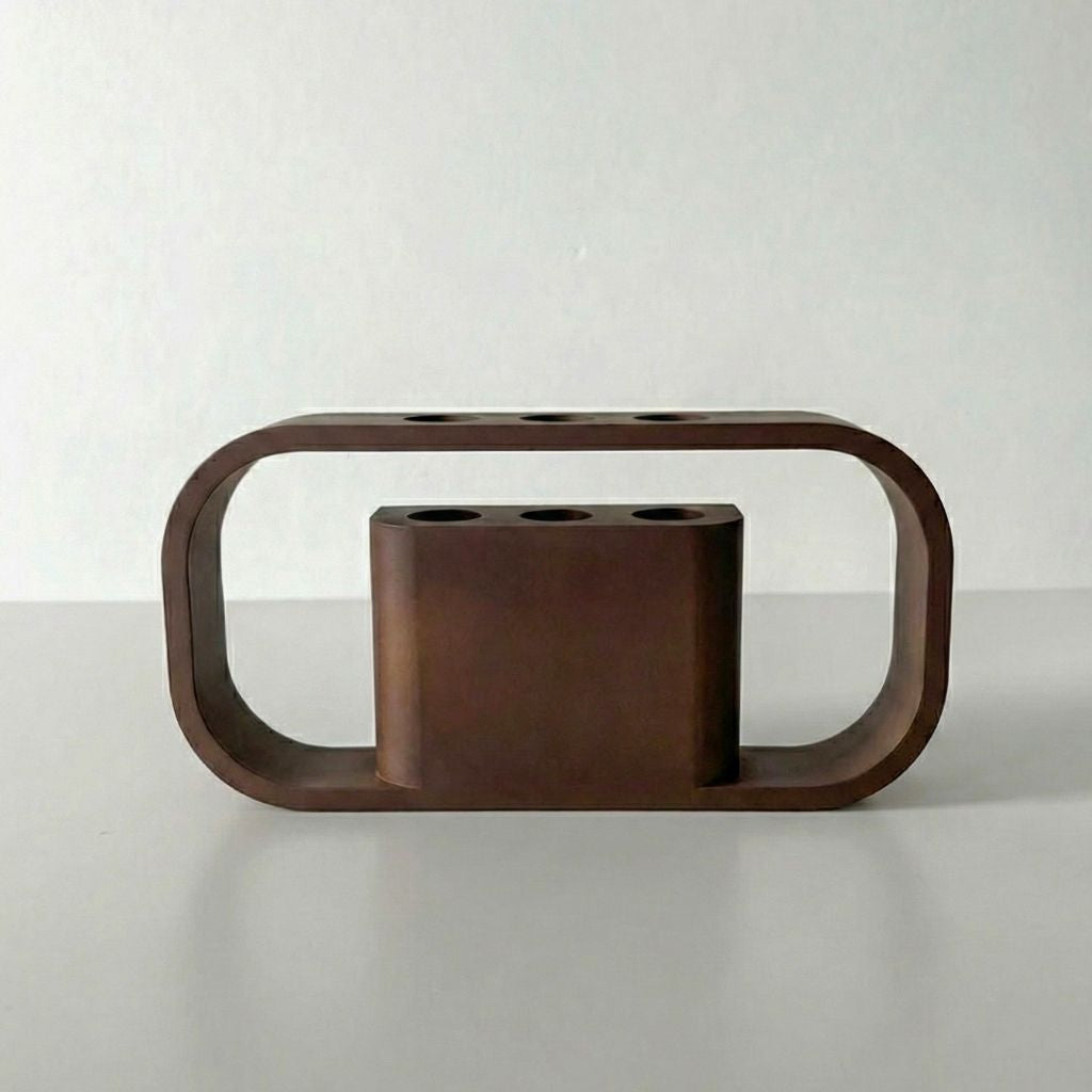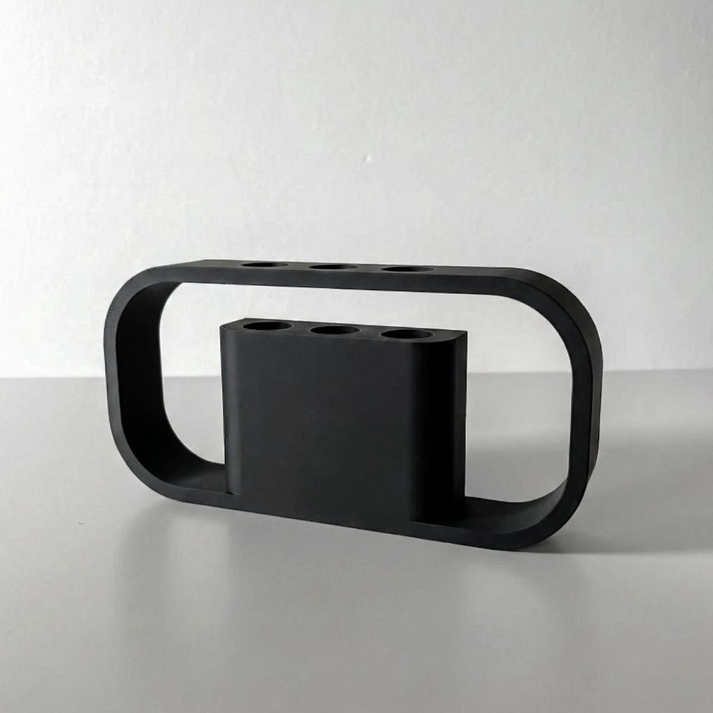 Portalápices geométrico ovalado diseñado para optimizar el espacio en escritorios ejecutivos. Su estructura permite mantener orden visual. Fabricado mediante impresión 3D en PLA biodegradable, ofrece un acabado negro mate resistente ideal para entornos de oficina modernos.